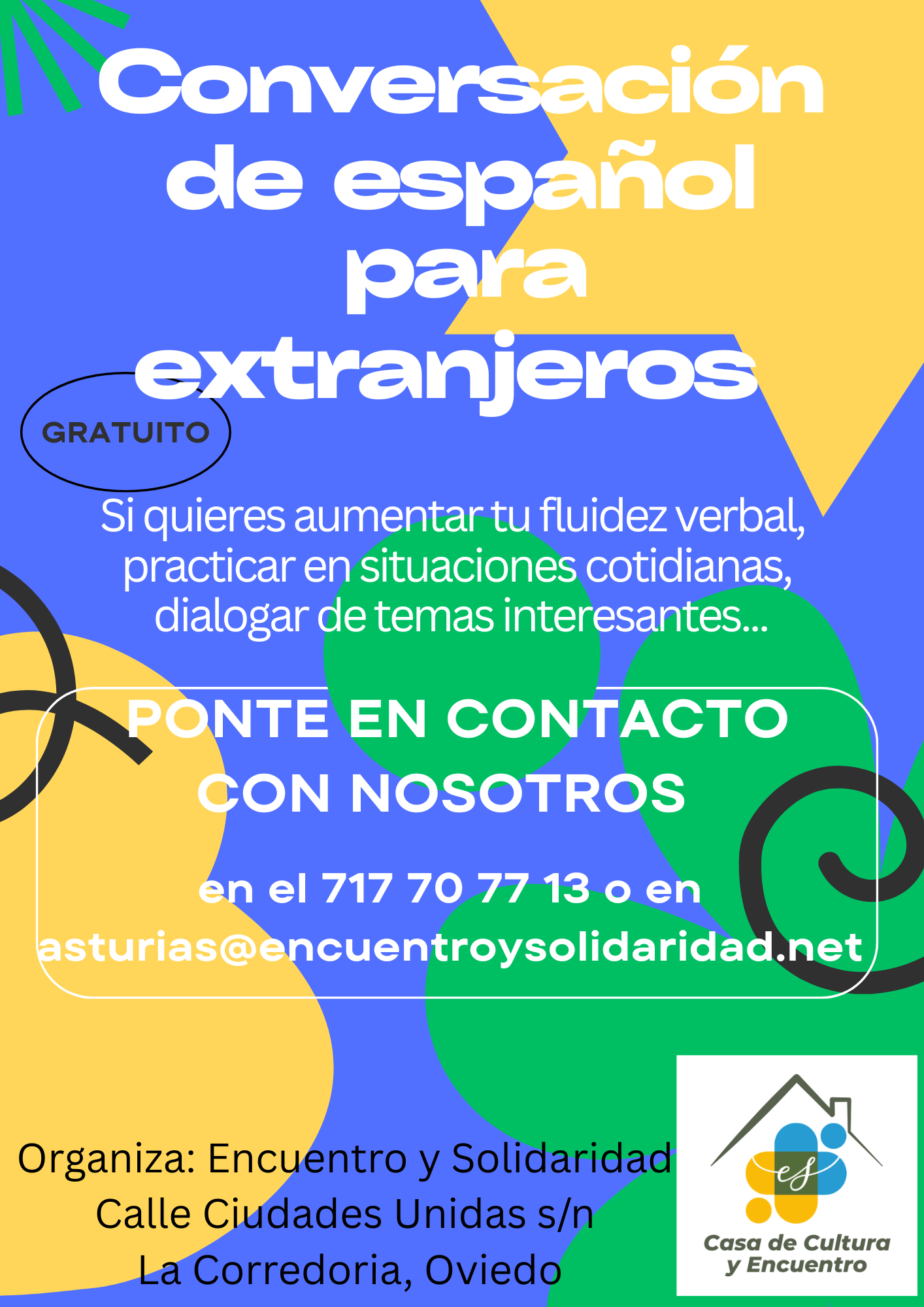 Oviedo. Casa Cultura y Encuentro C/ Ciudades Unidas, Oviedo, EspañaPara personas extranjeras que teniendo un nivel de español, necesitan una mayor fluidez y expresarse en situaciones cotidianas. Con actividades muy variadas que nos dan pie a la conversación. ¿Dónde? […]