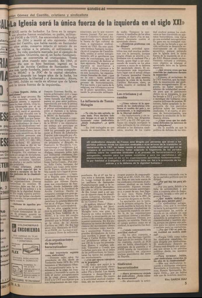 He abandonado la actividad sindical porque los sindicatos se han convertido en aparatos burocráticos, cosa lógica en una sociedad neocapitalista. Yo para eso no trabajaré nunca. Eso me ha llevado a que mi vida militante se desarrolle exclusivamente en el terreno apostólico, porque entiendo que la Iglesia será la única fuerza de la izquierda en el siglo XXI. Hemos creado un movimiento cultural y cristiano, cuyo objetivo es relanzar el apostolado laico en la Iglesia española. - ¿Qué errores crees que han cometido los sindicatos durante la transición?